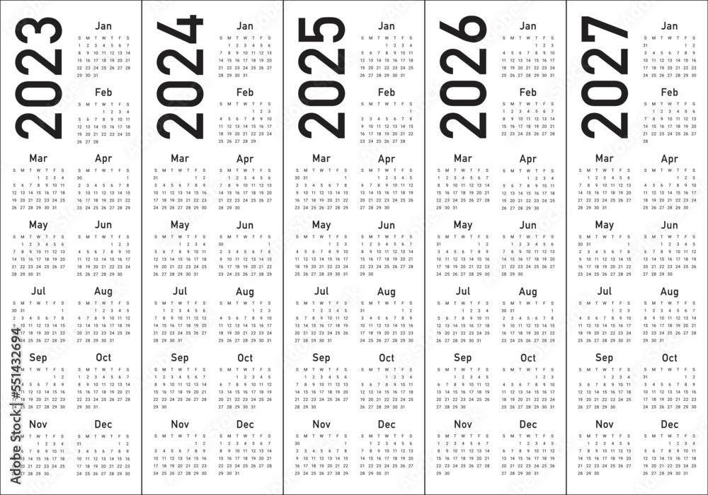 Source : print-a-calendar.com2023 2025 2025 2026 2027 calendar year vector design template